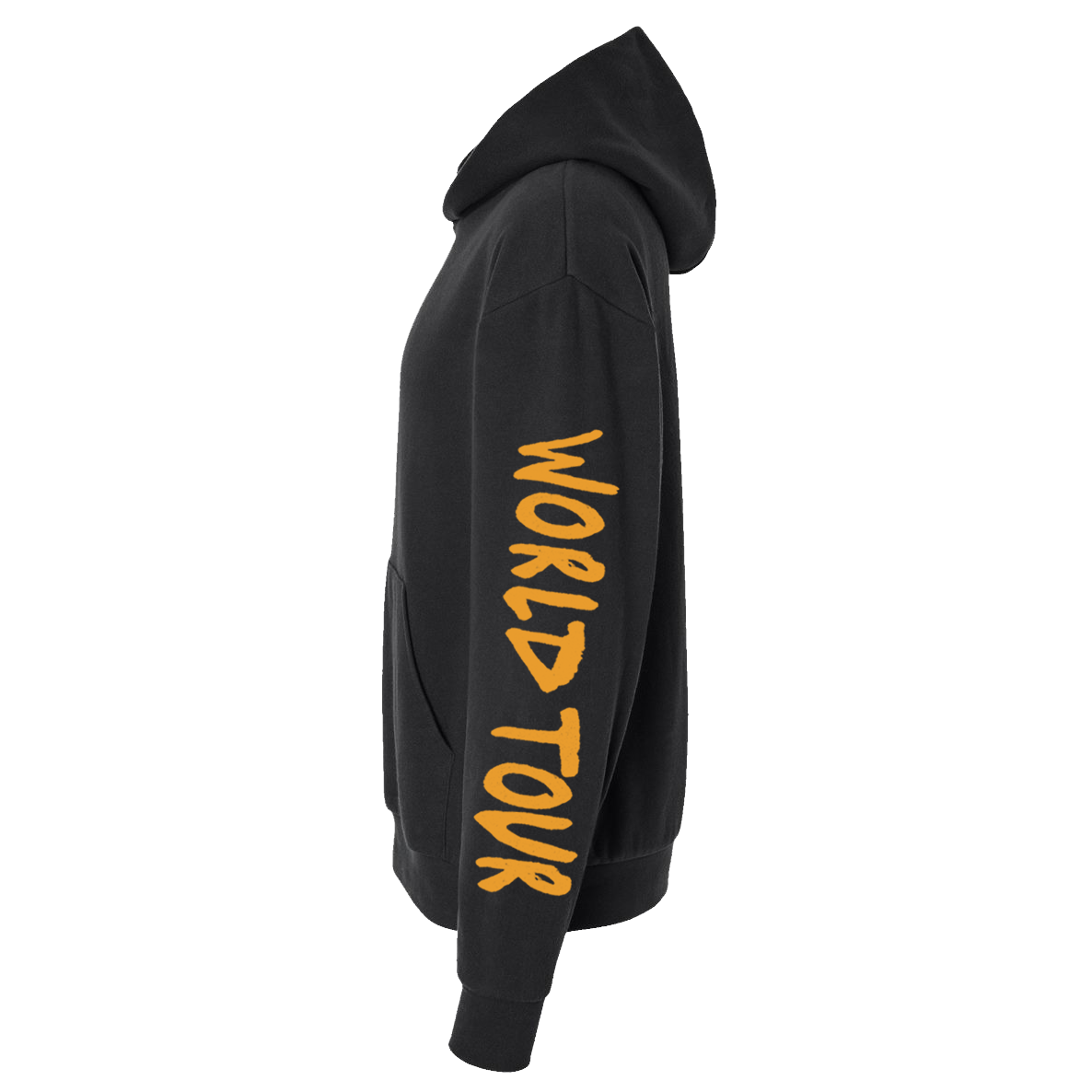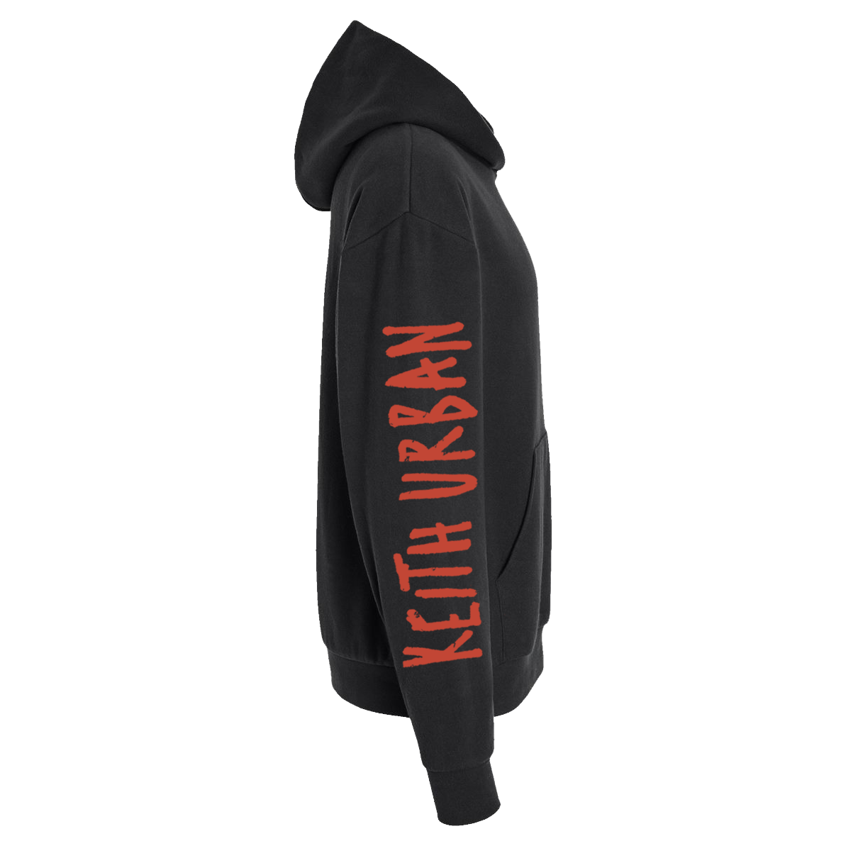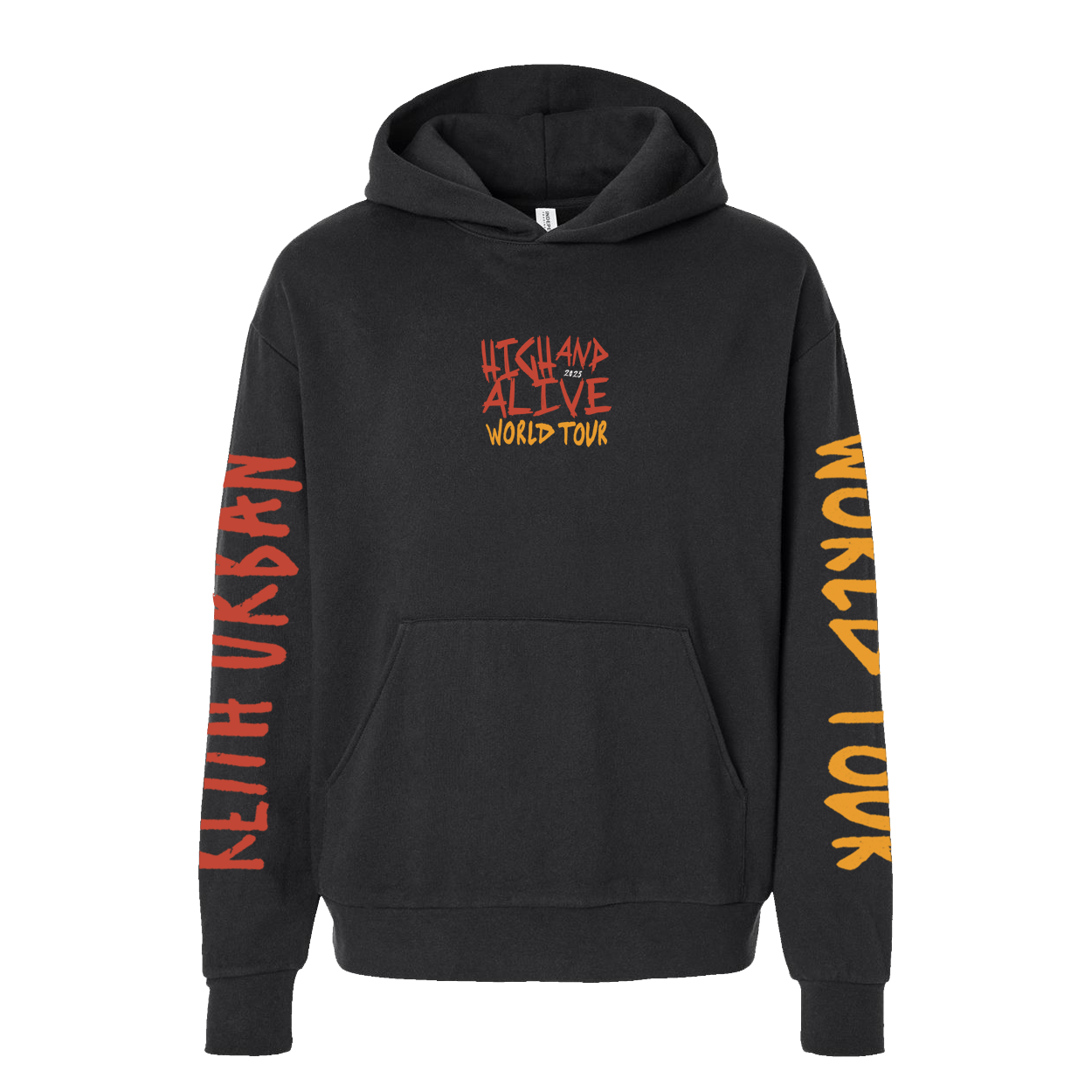 • Black, oversized hoodie featuring "HIGH AND ALIVE WORLD TOUR 2025" on the front, a live image of Keith and HIGH AND ALIVE WORLD TOUR 2025 cities on the back, "KEITH URBAN" on the right sleeve, and "WORLD TOUR" on the left sleeve.