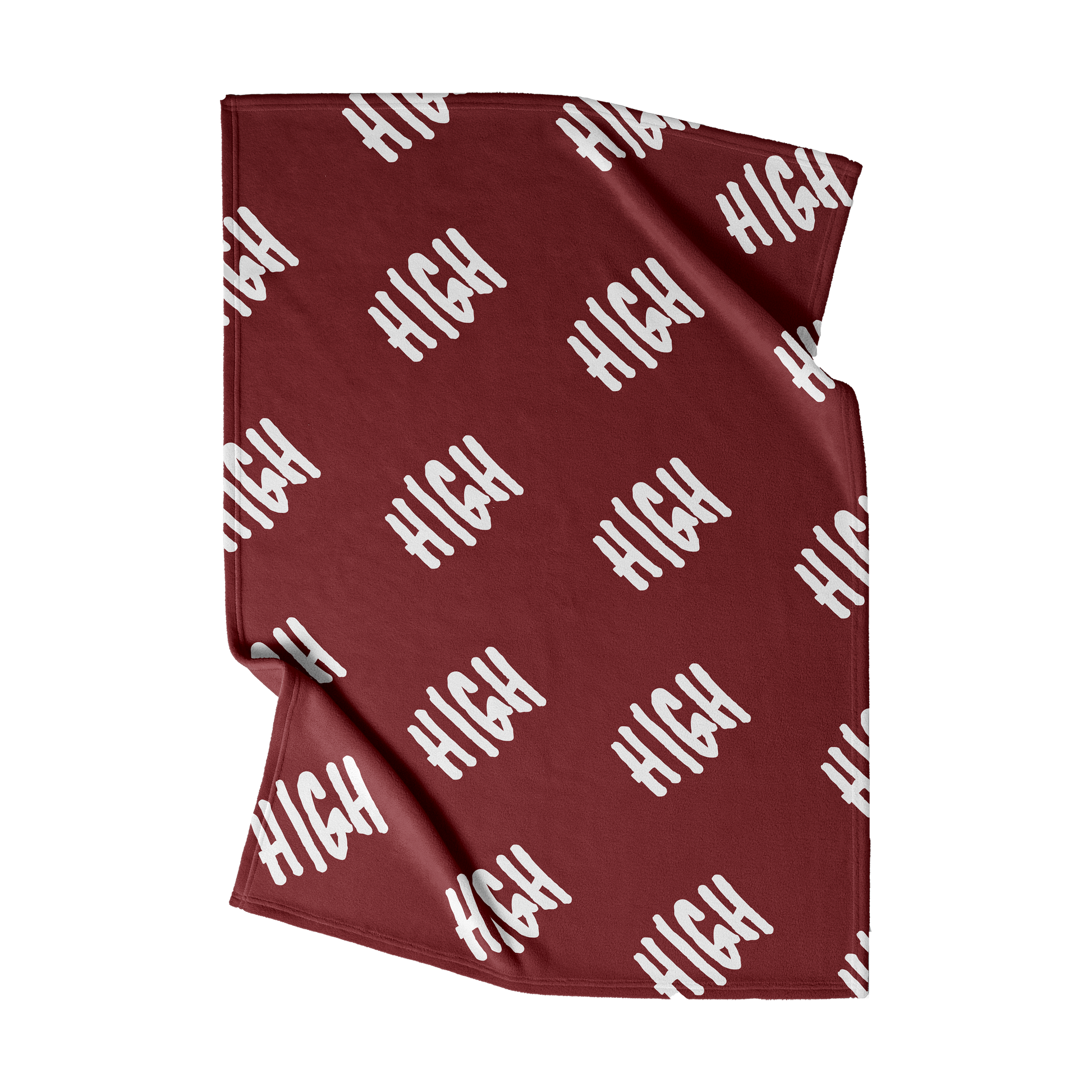 • Burgundy blanket featuring "HIGH" design in white. Print is on both sizes.
