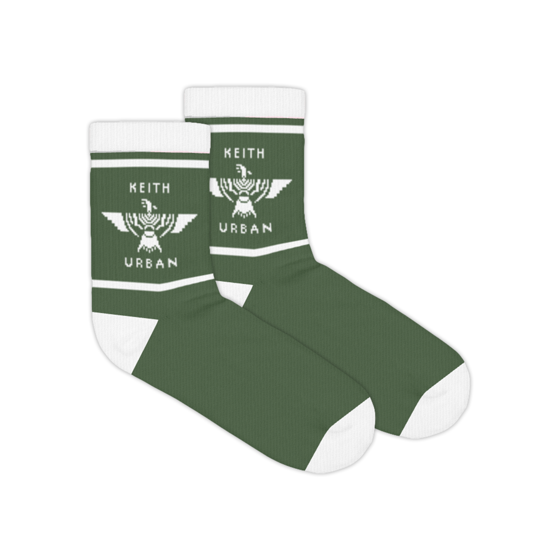 Athletic quarter crew socks in pine and white featuring Keith's name and his iconic phoenix logo on the ankle.